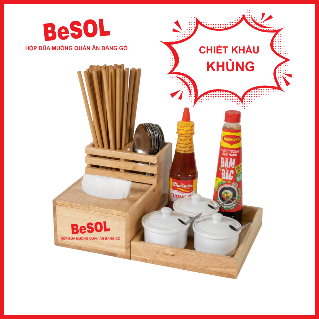 • Khay đựng gia vị hũ đũa gỗ BeSOL: Sản phẩm kết hợp đựng hũ gia vị và muỗng đũa, rất phù hợp để đặt trên bàn ăn tại quán phở, bún, cơm tấm, giúp thực khách dễ dàng sử dụng và tăng trải nghiệm.
