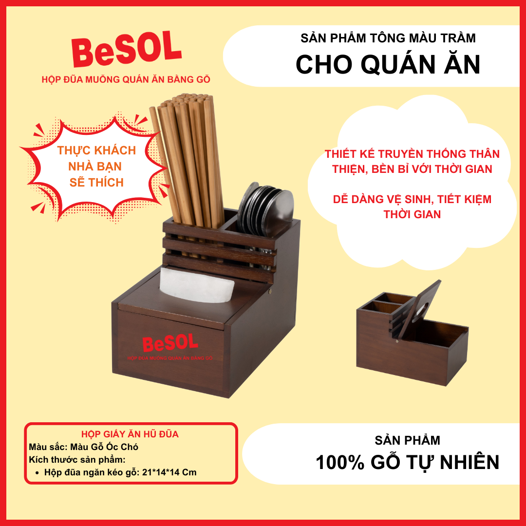 Hộp đựng giấy ăn đũa thìa (muỗng) bằng gỗ BeSOL – Giải pháp tiết kiệm để nâng cao trải nghiệm cho thực khách.