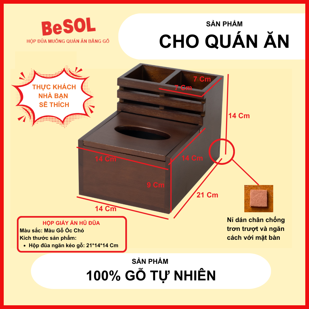Một chiếc Hộp đựng giấy ăn bằng gỗ BeSOL không chỉ sạch sẽ, sang trọng và bền bỉ, thân thiện mà còn giúp bạn tạo ra một “điểm chạm” lớn trong lòng thực khách. Thử nghĩ xem, suốt quá trình ăn tại quán, thực khách của bạn sài gì nhiều nhất, chính là Hộp đựng giấy ăn Khay đựng gia vị đó. Đừng bỏ qua cơ hội ghi điểm với những thực khách yêu quý của bạn nhé. Và chắc chắn họ sẽ quay lại với quán của bạn nhiều lần hơn nữa.